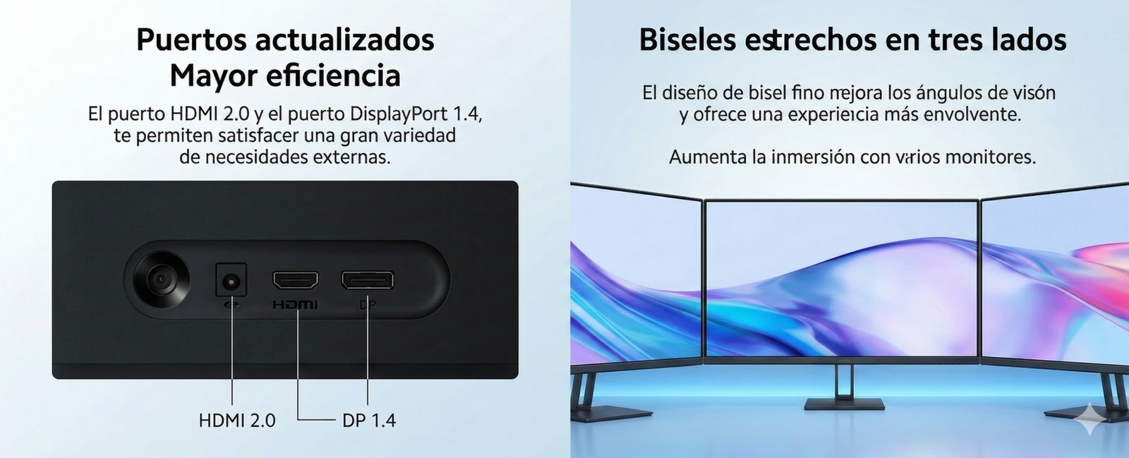 • Marcos Minimalistas: Bordes reducidos en tres de sus lados para una experiencia inmersiva, ideal para configuraciones de doble monitor.